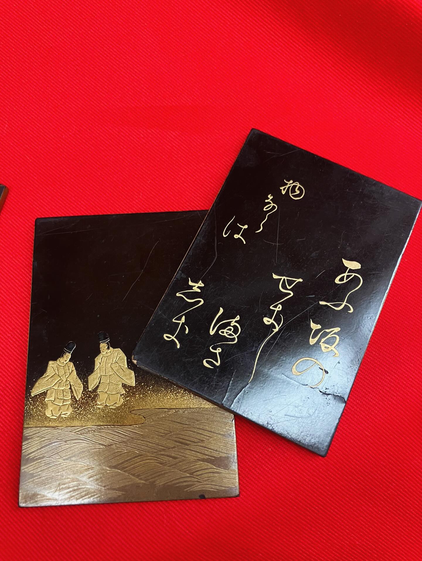 「こんなカルタ見たことない…!」 写真は大変珍しい蒔絵のカルタ 漆黒に金の流麗な筆致、和歌と絵の美が一枚に凝縮された逸品です。4枚展示中。 コヤノ美術館大阪本館 「百人一首とカルタ展」開催中🎴 #コヤノ美術館 #京橋 #百人一首とカルタ展 #蒔絵 #カルタ #和の美 #漆工芸